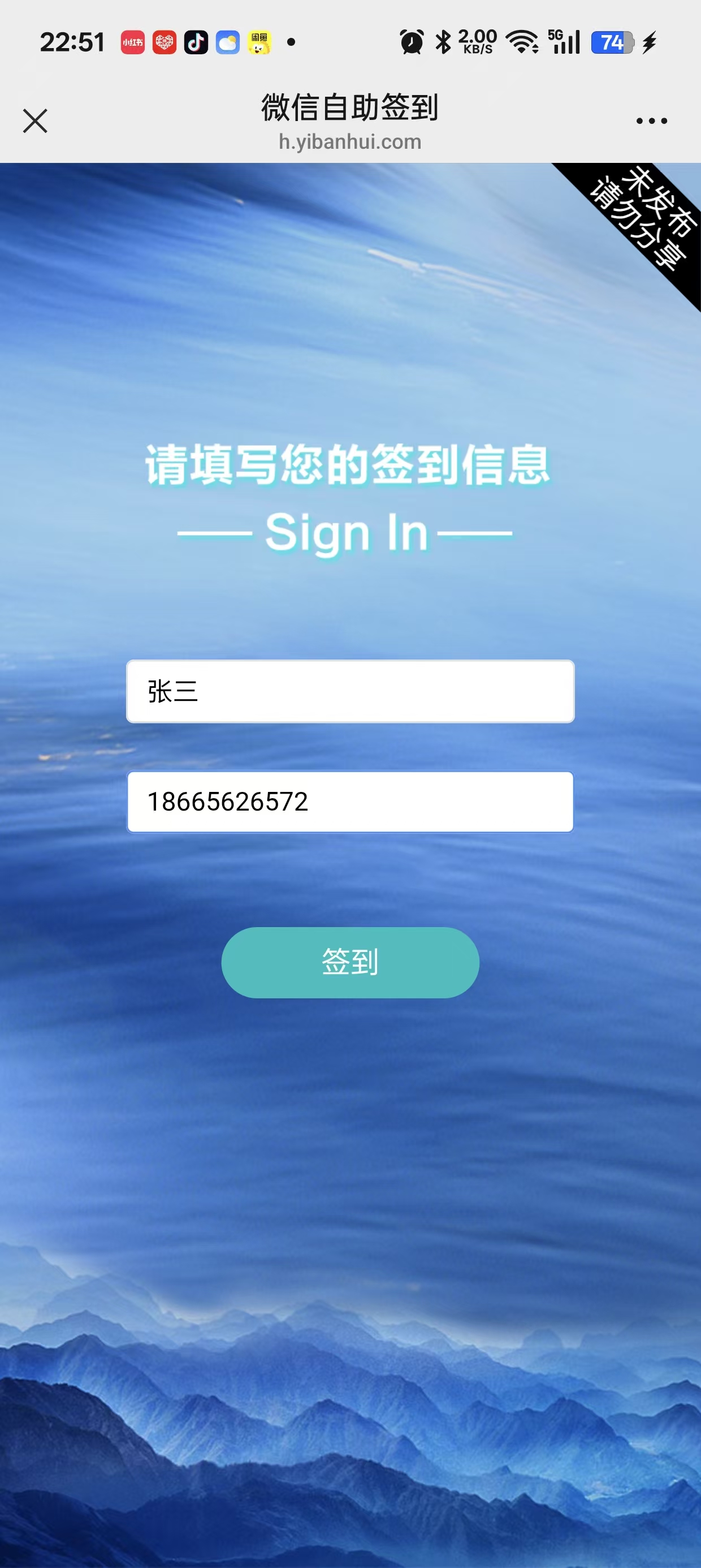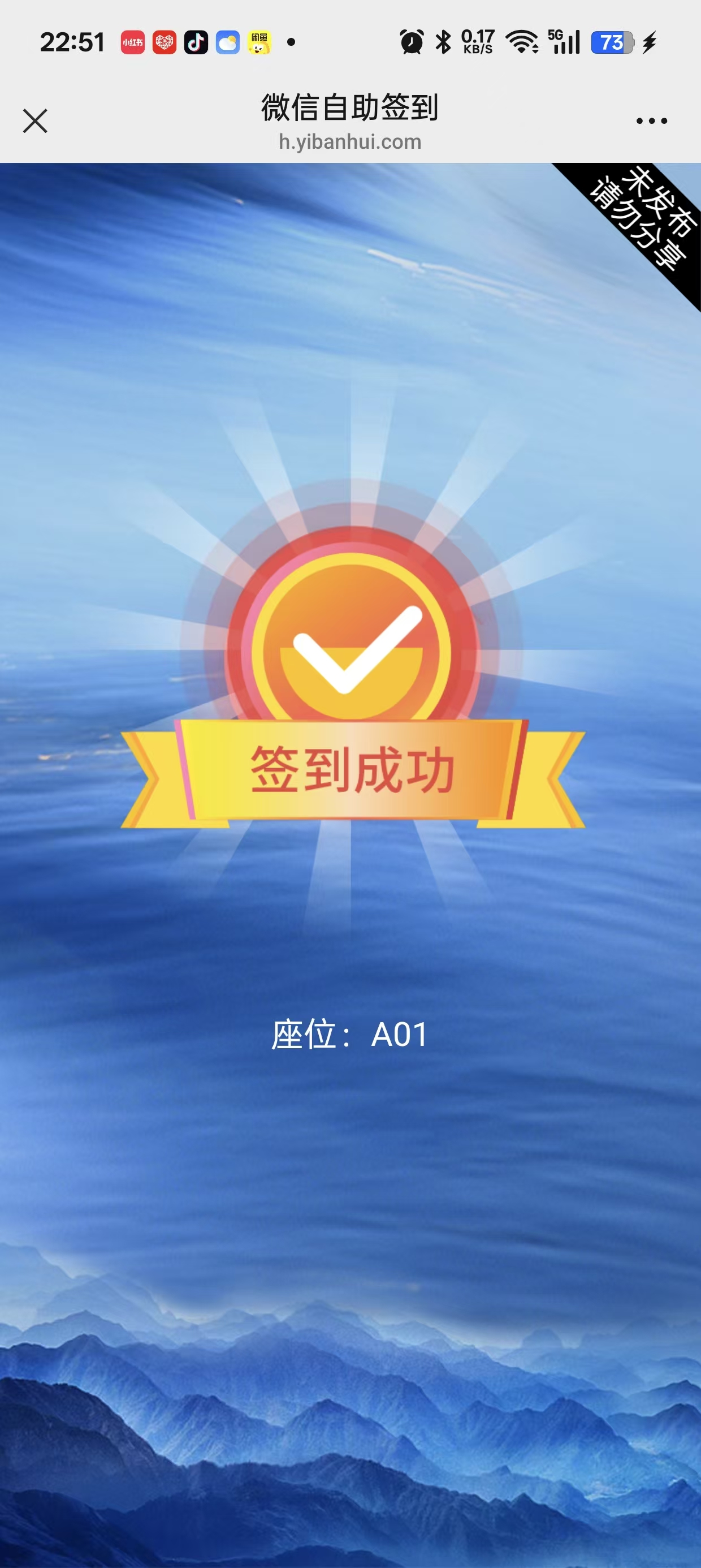 5、打开签到二维码,用手机扫码,输入姓名和手机号进行签到,签到成功后就可以显示自己的座位信息。