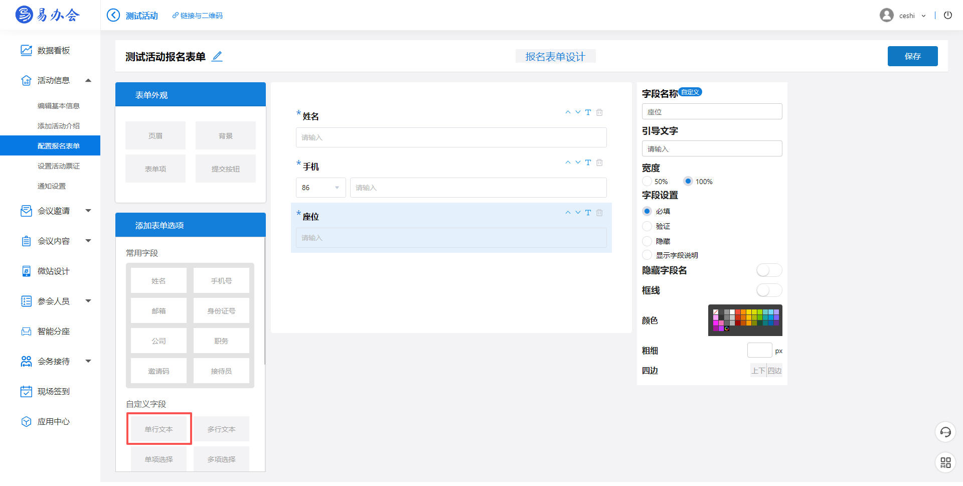 1、进入【配置报名表单】设置表单字段,如姓名、手机号、座位号(自定义字段-单行文本)