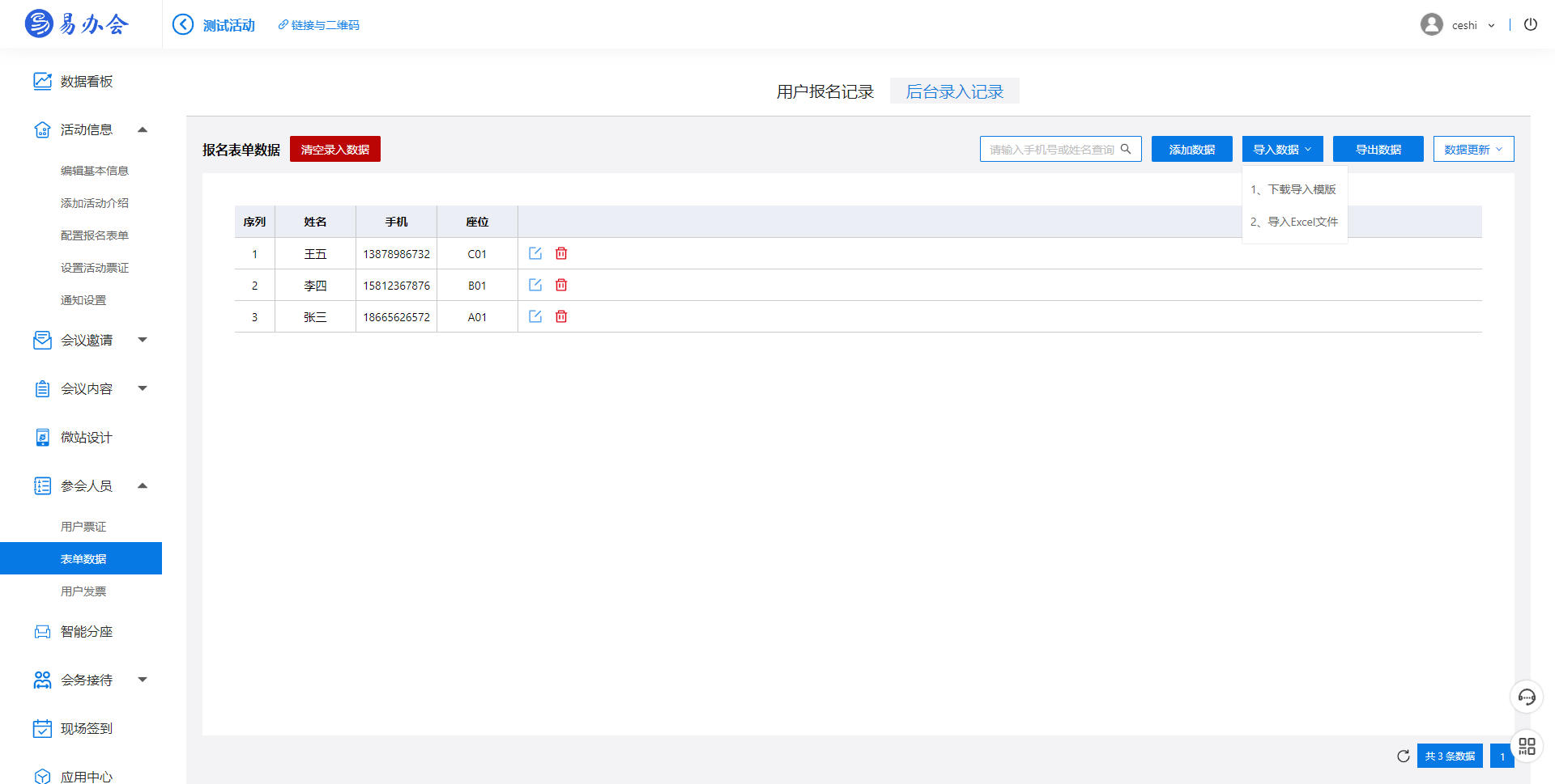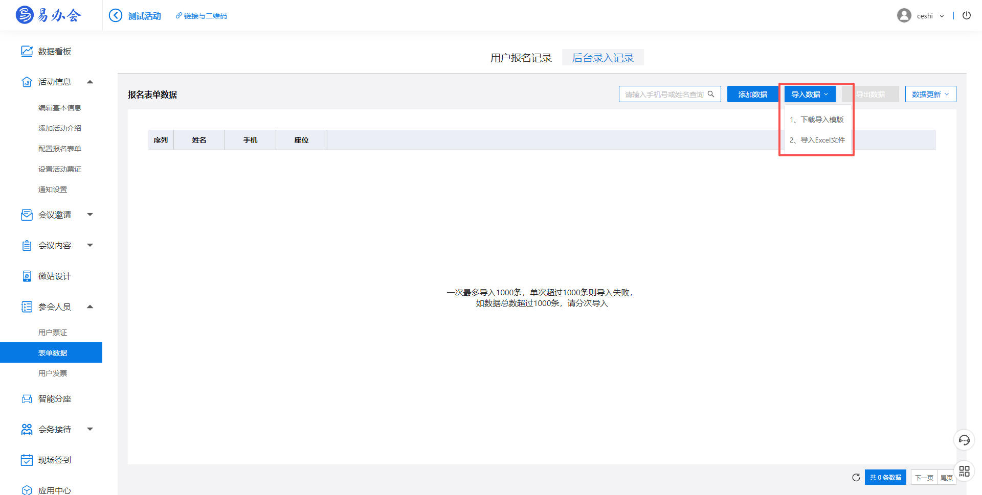 2、进入【参会人管理-表单数据-后台录入记录】下载导入模版,导入数据