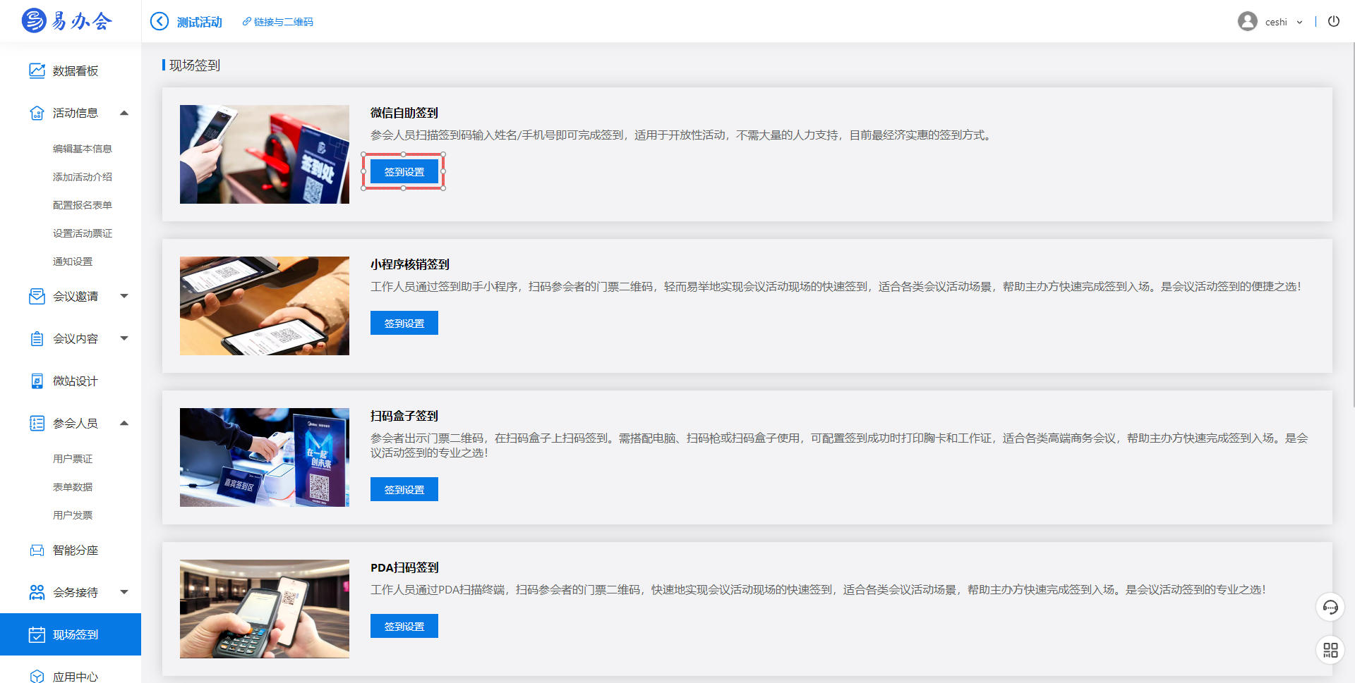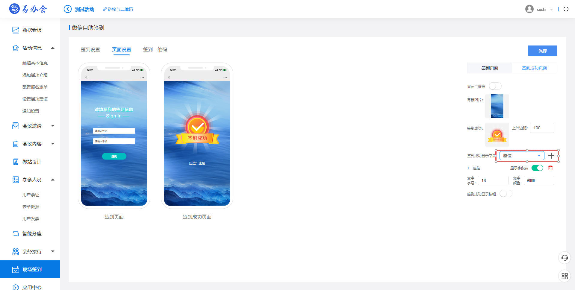 3、进入【现场签到-微信自助签到】设置的签到成功页面设置